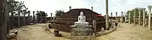 The temple is situated on a small hillock near the sea coast about 47 km (29 mi) to the north of Trincomalee. The summit is occupied by a Vatadage containing the Stupa in the centre. The Stupa was originally small in size and had been enlarged in the 8th century A.D.[7] The Vatadageya covers the Stupa with concentric circles of stone pillars similar to Thuparama and Lankarama Stupas at Anuradhapura.[8] The stone made circular platform of the Vatadageya is opened to the four directions and accessed by flight of steps with guardstones (Muragala) and balustrades (Korawak Gala) showing the usual Sinhalese architecture.[8] On the terraces lower than the Vatadageya are vestiges of monastic structures including ruined buildings, stone pillars, flight of steps, ponds, and remains of a stone bridge. The slope of the hill are some rock caves, two of which contain Brahmi inscriptions, one in the pre-Christian form of that script and the other dating from about the first century.[9] To the South of the Vatadageya is another rock inscription engraved on the a rock surface, which contain eleven line of writings revealing the names of two merchants as well as the temple.