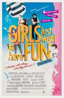 Girls Just Want to Have Fun is a 1985 American romantic comedy dance film directed by Alan Metter and distributed by New World Pictures. It was written by Amy Spies and stars Sarah Jessica Parker, Lee Montgomery, Morgan Woodward, Jonathan Silverman, Shannen Doherty, and Helen Hunt.[3] Its story follows Janey, a new girl in town who meets Lynne and discovers they both share a passion for dancing and the TV show Dance TV. Together the two enter a competition to be a new Dance TV regular couple, however Janey's father doesn't approve.
