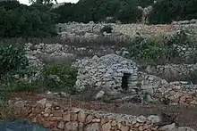 Giren are huts constructed out of undressed dry stone, and they were usually built out of loose pieces of coralline limestone,[7] which were either obtained through quarrying[8] or through clearing loose stones from a piece of land in order to allow for it to be cultivated.[6] The walls are usually around 90 cm (35 in) thick,[7] and they consist of two skins of stone with a rubble infill known as mazkan in between.[5] The roof of the girna is constructed using corbelling, with each row of stones jutting out slightly from the row below it, gradually reducing the size of the opening until flat stone slabs can be used to span it. This results in a dome-shaped concave ceiling,[7] bearing similarities to ancient beehive tombs.[3] Gravel and torba were usually used to cover the roof,[2] while sometimes a pebble-like material called ċagħqija was used for this purpose.[7]
