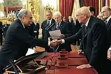 ![]() Giuseppe Frigo (left) with Italian President Giorgio Napolitano (right) | |