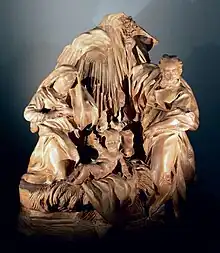 Mazza mainly worked in terracotta, as in the Lamentation of Christ in St. Mary Magdalene, Bologna, and in stucco as in the churches of Corpus Domini in Bologna, the Annunciata in Pesaro and the Suffragio in Fano.[2] His early training as a painter is reflected in his later work.[6] His sculptures have a pictorial quality.[7] They are balanced and self-contained.[5] His work shows the influence of Algardi but have the vivacity of 18th century styles.[2] This contrasts with the High Baroque style that was then in fashion in Rome.[4]