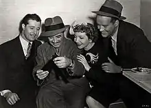 ![]() Left to right: Don Ameche, Joseph Valentine, Claudette Colbert, and Dick Foran on the set of Guest Wife (1945). | |