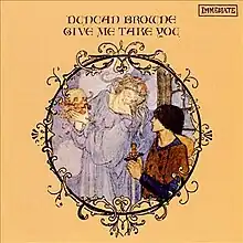 Give Me Take You is the debut studio album by English singer-songwriter and musician Duncan Browne. It was released in 1968 through Andrew Loog Oldham's Immediate Records. On the record, Browne employs a folk music sound that is informed by rock, pop, and classical elements, with baroque-inspired arrangements.[2][3] The album spawned the single, "On the Bombsite," which failed to chart.[2]