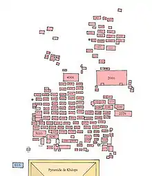 The West Field is located on the Giza Plateau, to the west of the Great Pyramid of Giza. It is divided up into smaller areas like the cemeteries known as the Abu Bakr Excavations (1949–50, 1950–51, 1952 and 1953), as well as several cemeteries whose toponyms are based on the mastaba numbers such as Cemetery G 1000 and Cemetery G 1100. The West Field contains Cemetery G1000 – Cemetery G1600, and Cemetery G 1900. Further cemeteries in this field are: Cemeteries G 2000, G 2200, G 2500, G 3000, G 4000, and G 6000. Three other cemeteries are named after their excavators: Junker Cemetery West, Junker Cemetery East and Steindorff Cemetery.[1]