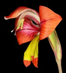 Gladiolus alatus produces large orange flowers.[3] Each plant has between two and eight flowers borne in a spike inflorescence. The lower halves of upper lateral tepals are covered in red hairs, the areas between them thickened into hairy, iridescent ridges.[4] The lower tepals are yellow-green towards the base with orange tips.[5] The funnel-shaped perianth tube is 10–14 mm (0.39–0.55 in), with anthers and stamens arising near the middle.[4][5] The arched filaments are hairy and green or yellowish in colour with purple lines and bear stamens with yellowish pollen[4] They are present between August and October and have a sweet scent.[4][5] Each flower lasts about a week.[5] The green floral bracts are strongly keeled and have purple margins. The inner bracts are slightly shorter and have two keels.[4]
