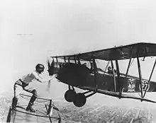 Gladys Ingle became the only female member of the 13 Black Cats.[1] She performed in aerial stunts during the 1920s and 1930s.[4][2] She was renowned for her stunts and wing walking.[1] Some of her stunts included moving from plane to plane in mid-air, and flying on the wing of a plane while it passed under a bridge.[1] One of Ingle's stunts involved replacing a wheel in mid-air.[1][5] A wheel would conveniently fall off an airplane. Ingle would strap a spare wheel on her back and rendezvous with the "stricken" plane. In mid-air, she would climb to the top of the upper wing of the second plane and transfer to the bottom wing of the plane in distress. She would then climb down to the landing gear and install the wheel.[5][6] This was filmed on at least one occasion.