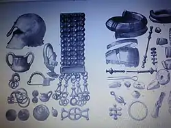 A total of 1,234 mounds were excavated in the 19th century, about 250 empty.[2] There are also cremation and skeletal graves in the tumulus, in which numerous grave goods were found (metal tools, weapons and jewelry, ceramics).[8] These side dishes are mostly domestic products, with local characteristics.[9][10]