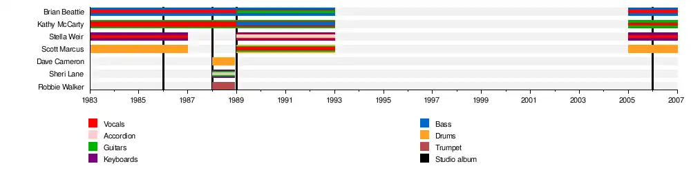 The band broke up in 1993 following some friction relating to their attempts at signing to a major label. Kathy McCarty went on to make several solo records, including the acclaimed[13] Dead Dog's Eyeball, a cover album of Daniel Johnston songs[14] that was re-released in 2005,[15] and its subsequent EP, Sorry Entertainer. In 2005, she released her own record of original songs called Another Day In The Sun. In 1987, Stella Weir and Scott Marcus played in the band Prohibition for one album, Flophouse. Marcus has also played with The Asylum Street Spankers and Starfish. Brian Beattie has continued his career as a record producer,[16] working with The Dead Milkmen, Ed Hall, Daniel Johnston, and Okkervil River among others. In 2014 Beattie released his first solo record, Ivy and the Wicker Suitcase,[17][18] a musical audiodrama on disc that comes in a fully illustrated book, featuring art by his wife Valerie Fowler.