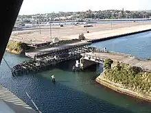 Glebe Island was a major port facility in Sydney Harbour and, in association with the adjacent White Bay facility, was the primary receiving venue for imported cars and dry bulk goods in the region until 2008.[1] It is surrounded by White, Johnstons, and Rozelle Bays. Whilst retaining its original title as an "island", it has long been infilled to the shoreline of the suburb of Rozelle and connected by the Glebe Island Bridge (and its replacement the Anzac Bridge) to Pyrmont.