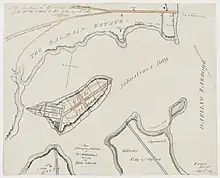 The rocky outcrop known as Glebe Island was originally accessible from the Balmain shoreline only at low tide, until a causeway was laid in the 1840s. Surveyor William Wells created a subdivision for the Balmain end of the island in 1841, with four intended streets and six sections containing a total of 86 lots.[2] The subdivision did not eventuate.