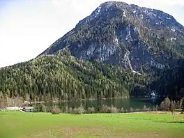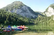 Gleinkersee ist a popular day trip destination for hiking, due to the scenic views of Totes Gebirge and Nationalpark Kalkalpen. Facilities at the north shore include Gasthof Seebauer, an inn, a camping site, two ropes courses and a rental for boats and paddle boards. The weak water movement and the location sheltered from wind enable rapid warming of the upper water layers.[1] Therefore, the local tourism office describes Gleinkersee as one of the warmest bathing lakes in Austria. Bathing jetties and a sunbathing lawn are located on the shore.[4]