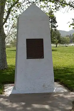• This campsite on both the Mojave Trail over the mountains and the Cajon Pass Route was probably first seen by Spanish and American travellers in the 1770s and was noted by them in 1806, 1849 and 1850. Michael White, grantee in 1843 of the Muscupiabe Rancho lived near by. The Mormon colony camped in 1851 on either side of this little pass for about four months while Amasa Lyman, Charles Rich, Jefferson Hunt, David Seely and Andrew Lytle negotiated the purchase of the San Bernardino Rancho from the Lugo family. Erected 1972 by San Bernardino Society of California Pioneers in 1927 at a site .08 mile south, moved and rededicated here at Glen Helen Regional Park by the Society and Lugonia Parlors No. 241 N.D.G.W. (Marker Number 573.)[6]