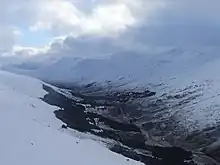 The glen runs approximately 9 miles from south-east to north-west, from the Cluanie Inn (216 metres, 708 feet) at the western end of Loch Cluanie and the start of Glenmoriston to sea level at the village of Shiel Bridge and Loch Duich.[1] The northern side of the glen lies within the Kintail and Morvich estate owned by the National Trust for Scotland.[2] The lower part of Glen Shiel, including both sides of the glen from the site of the Battle of Glen Shiel down to Dornie on the shores of Loch Duich, lies within the Kintail National Scenic Area,[3] one of the forty national scenic areas in Scotland.[4]