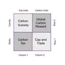 Delton Chen calls this relational diagram the carbon pricing matrix.[4] The matrix denotes four market policies: the (1) carbon tax, (2) carbon subsidy, (3) cap and trade, and (4) global carbon reward. The left side of the carbon pricing matrix is consistent with Arthur C. Pigou’s 1920 treatise on externalised costs and his proposed method of pricing negative externalities with taxes, and pricing positive externalities with subsidies. The objective of the carbon tax is ostensibly to achieve allocative efficiency by internalising the SCC. In standard economics there is no mention of an explicit objective when using the carbon subsidy, although such subsidies have been used, such as the 45Q tax credit in the United States for carbon oxide capture and sequestration.[21]