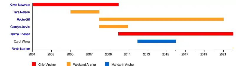 - Kevin Newman (anchor/executive editor, 2001–2010): formerly host of Kevin Newman Live on CTV News Channel and CTV's Question Period