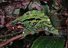 The globe-horned chameleon or flat-casqued chameleon (Calumma globifer) is a large species of chameleon endemic to isolated pockets of humid primary forest in eastern and south eastern Madagascar. It is listed on CITES Appendix II, meaning trade in this species is regulated.
