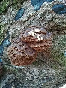 The fruit bodies of the fungus measure between 5–20.5 cm (2.0–8.1 in) wide and tall, and consist of small overlapping stipe-less caps originating from a central core. Caps have a leathery to rigid texture with a slightly velvety surface and radial wrinkles on the edges. Adjacent caps can be fused together and have petal-shaped projecting margins. Initially dull yellow-brown with a tan margin, they mature to become dark brown to greyish black in age. The fibrous and tough flesh is yellowish brown and up to 6 mm (0.24 in) thick. The pore surface, initially purplish gray before turning dark grayish brown, comprises small circular pores numbering 3–5 per millimeter.[7]