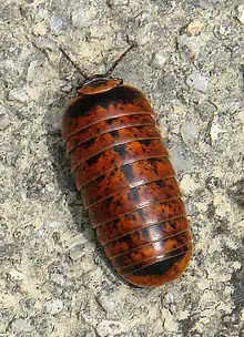 Glomeris klugii exhibits a wide range of colour variation. Many colour morphs and subspecies exist, each displaying unique colour patterns.[2] The base colour of the species typically ranges from light brown to red,[2] with many possessing vividly coloured chitin and a distinct marbled pattern.[3] However, the presence of black freckles on their bodies varies, with some individuals having freckles that fuse into larger spots, while others are fully black in colour.[2] G. klugii can reach a length of about 13.5 mm (0.53 inches) and a width of up to 6.25 mm (0.24 inches).[3] Telopods exhibit syncoxite with slight variations in the central lobe shape and delicately bifurcated coxal horns.[3] G. klugii also lacks a main stria on the thoracic shield.[2]