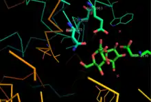 Glucansucrase allows the oral bacteria Streptococcus mutans to metabolize sucrose into lactic acid. This lactic acid lowers the pH around teeth and dissolves calcium phosphate in tooth enamel, leading to tooth decay.[14] Additionally, the synthesis of glucan aids S. mutans in adhering to the surface of teeth.[15][16] As the polymers accumulate, they help more acid-producing bacteria stay on teeth. Consequently, glucansucrase is such an attractive drug target to prevent tooth decay. If S. mutans can no longer break down sucrose and synthesize glucan, calcium phosphate is not degraded and bacteria cannot adhere as easily to teeth.