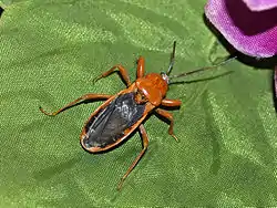 These medium-sized bugs are brightly metallic red or orange and bluish black or dark brown colored, an aposematic coloration. The females are wingless and are similar to the nymphs.[1]