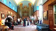 John Christie obtained the use of the house in 1913 after the death of William Langham Christie, his grandfather.[13] He came into full legal possession of the estate in 1920.[13] Among other renovations, he added to the house an organ room, 80 feet (24 m) long, in the process almost doubling the length of the south façade of the house.[13] This room contained one of the largest organs outside of a cathedral in the country. It was built by the firm of Hill, Norman & Beard Ltd (bought by Christie in 1923). After the Second World War, John Christie made a gift of sections of the soundboards, pipes and structural parts to the rebuilt Guards Chapel, Wellington Barracks (which had been destroyed in the Blitz); the case and console remain at Glyndebourne.