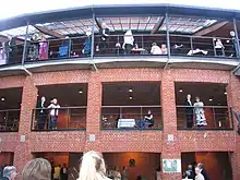 The design of the theatre, a large brick oval building, has resulted in a four-level, horseshoe-shaped auditorium with main level seating, two balconies, and a gallery topped with a circular roof. The over 60-foot (18 m) high stage building is semi-circular in shape and allows for the efficient flying and storage of scenery. The acoustics, by Derek Sugden and Rob Harris of Arup Acoustics, have received praise.[22]