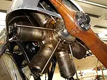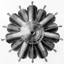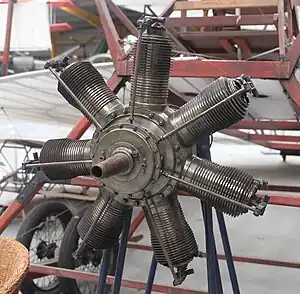 The Gnome 7 Omega (commonly called the Gnome 50 hp) is a French seven-cylinder, air-cooled aero engine produced by Gnome et Rhône.[2] It was shown at the Paris Aero Salon held in December 1908 and was first flown in 1909. It was the world's first[1] aviation rotary engine produced in quantity. Its introduction revolutionized the aviation industry[3] and it was used by many early aircraft. It produced 37 kW (50 hp) from its 8 L (490 cu in) engine capacity.[4] A Gnome Omega engine powers the 1912 Blackburn Monoplane, owned and operated by the Shuttleworth Collection, the oldest known airworthy British-designed aeroplane worldwide.[5] A two-row version of the same engine was also produced, known as the Gnome 14 Omega-Omega or Gnome 100 hp. The prototype Omega engine still exists, and is on display at the United States' National Air and Space Museum.[2]
