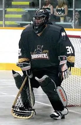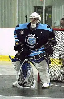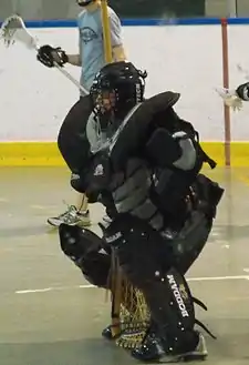 Goaltending in box lacrosse tends to be more like goaltending in ice hockey than field lacrosse.[26] The box goalie's stance is similar to an ice hockey goalie. The goalie crouched, but with his knees spread, not pinched like in ice hockey. Heels shoulder-width apart, toes generally pointed on an outward angle to allow for stepping into the shot. One hand sits on top of the thigh, holding the goal stick in a position to cover the five-hole (the area between the legs) and the other hand is resting or propped out in the vicinity between the waistline and the outside of the upper thigh. The elbow is propped out, ready to swing out towards a high shot.[27][28]