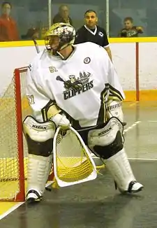 The goaltender or goalie is a playing position in indoor or box lacrosse. More heavily armoured than a field lacrosse goaltender,[1] since the invent of indoor lacrosse in 1931,[2] the box lacrosse goalie has evolved into a much different position than its field lacrosse cousin.[3]