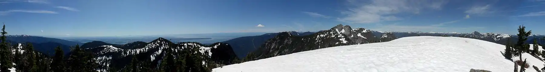 A 360 degree panoramic view from the top of Goat Mountain, overlooking Greater Vancouver, Howe Sound, Washington state, the Strait of Georgia, Vancouver Island, and the Coast Mountains.