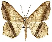 It is a pale brownish to creamy coloured moth. Postmedial line of forewing is found very close proximity to the margin. The caterpillar has a slender whitish body. Head, first thoracic segment and anal segment and clasper are all yellowish brown. Body consists regular pattern of black spots and diamond-shaped spots. Its host plant is Acacia mangium.[4]
