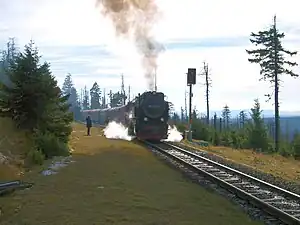 Goetheweg station (German: Bahnhof Goetheweg) is located between the stations of Schierke and Brocken on the Brocken Railway in the Harz Mountains of Central Germany at a height of 956 m above sea level. The track layout today consists, as in the past, of a horizontal reversing track (Rückdrückgleis) and just one turnout, whilst the running line maintains its continuous gradient of 33 permille.
