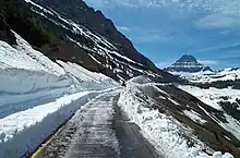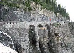 Going-to-the-Sun Road is a scenic mountain road in the Rocky Mountains of the western United States, in Glacier National Park in Montana. The Sun Road, as it is sometimes abbreviated in National Park Service documents, is the only road that traverses the park, crossing the Continental Divide through Logan Pass at an elevation of 6,646 feet (2,026 m), which is the highest point on the road.[3] Construction began in 1921 and was completed in 1932 with formal dedication in the following summer on July 15, 1933.[4][5] Prior to the construction of the road, visitors would need to spend several days traveling through the central part of the park, an area which can now be traversed within a few hours, excluding any stops for sightseeing or construction.