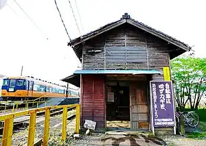The station has a single island platform connected to a rustic wooden station building by a level crossing. The station is unattended.