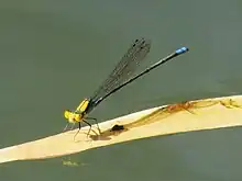 The gold-fronted riverdamsel (Pseudagrion aureofrons) is a damselfly species in the family Coenagrionidae.[3][4] Its body length is 36 millimeters. They are also known as gold-fronted sprites. Gold-fronted riverdamsels can be found near running or still water. They usually fly close to the surface of water, sometimes resting on floating material. They may not be as abundant as their relative the blue riverdamsel, but they are easily recognized by their golden-yellow faces and thorax. Its status is fairly common. They can be found cruising above the water on sunny days along slow-flowing sections of creeks.