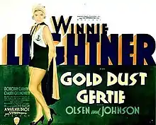 Gold Dust Gertie is a 1931 American pre-Code musical comedy produced and released by Warner Brothers. It was originally completed as a full musical. Due to the backlash against musicals, however, all the songs were cut from the film in all release prints in the United States. The film was originally known as Red Hot Sinners, but was released as Gold Dust Gertie after the musical numbers had been cut. The film was based on the play The Wife of the Party by Len D. Hollister. The film stars Winnie Lightner, Ole Olsen, Chic Johnson and Claude Gillingwater.[1]