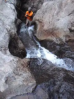 The hike to the hot springs is difficult and requires technical equipment such as ropes and ascending and descending gear.[5] There have been a number of fatalities (mostly from heat exposure) in the Canyon, including two hikers who died on one day in June 2003.[6] Although the trail was previously open year-round, in 2016 the National Park Service closed the trail in summer months (generally May 15 – Sept. 30) due to dangers from extreme heat.[7] To reach the hot springs from the trail, one encounters a series of eight difficult rope descents. After the descent, hikers reach a series of hot spring soaking pools, hot waterfalls and grottos.[1]