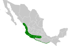 The nominate subspecies of golden-cheeked woodpecker is found in western Mexico between Sinaloa and Nayarit. M. c. flavinuchus is found from Jalisco in west central Mexico south along the coast to Oaxaca and east to Puebla. The species inhabits the interior and edges of mesophytic to xeric forest and more open landscapes like patches of forest, savanna with trees, and plantations. In elevation it ranges from sea level to about 1,500 m (4,900 ft).[4]
