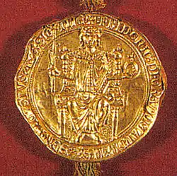 The Golden Charter of Bern (also: Golden Bull, in German: Goldene Handfeste or Berner Handfeste) is a medieval charter purporting to have been issued by Holy Roman Emperor Frederick II. It establishes the town privileges of Bern (now the capital of Switzerland), making it an Imperial Free City and, effectively, an independent state. The charter is dated to 1218, but is now believed by most scholars to be a Bernese forgery from the middle of the 13th century.[1]