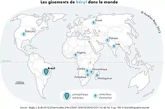 Beryl is a common mineral, and it is widely distributed in nature. It is found most commonly in granitic pegmatites, but also occurs in mica schists, such as those of the Ural Mountains, and in limestone in Colombia.[11] It is less common in ordinary granite and is only infrequently found in nepheline syenite. Beryl is often associated with tin and tungsten ore bodies formed as high-temperature hydrothermal veins. In granitic pegmatites, beryl is found in association with quartz, potassium feldspar, albite, muscovite, biotite, and tourmaline. Beryl is sometimes found in metasomatic contacts of igneous intrusions with gneiss, schist, or carbonate rocks.[12] Common beryl, mined as beryllium ore, is found in small deposits in many countries, but the main producers are Russia, Brazil, and the United States.[11]