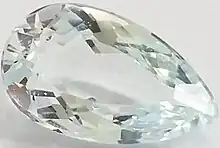 Aquamarine (from Latin: aqua marina, "sea water"[17]) is a blue or cyan variety of beryl. It occurs at most localities which yield ordinary beryl. The gem-gravel placer deposits of Sri Lanka contain aquamarine. Green-yellow beryl, such as that occurring in Brazil, is sometimes called chrysolite aquamarine.[18] The deep blue version of aquamarine is called maxixe[19] (pronounced mah-she-she).[20] Its color results from a radiation-induced color center.[21]