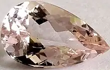 Morganite, also known as "pink beryl", "rose beryl", "pink emerald" (which is not a legal term according to the new Federal Trade Commission Guidelines and Regulations), and "cesian (or caesian) beryl", is a rare light pink to rose-colored gem-quality variety of beryl. Orange/yellow varieties of morganite can also be found, and color banding is common. It can be routinely heat treated to remove patches of yellow and is occasionally treated by irradiation to improve its color. The pink color of morganite is attributed to Mn2+ ions.[32]