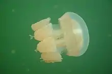 The golden jellyfish (Mastigias papua cf. etpisoni[1]) is a subspecies of spotted jellyfish (Mastigias papua) that inhabits Jellyfish Lake on Eil Malk island in Palau in the western Pacific Ocean.[2] Like the nominate subspecies, it derives part of its nutrition from symbiotic algae (Zooxanthellae) that live in their tissues and part of their nutrition from captured zooplankton.[3]