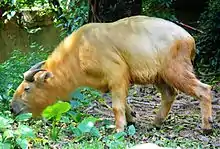 The golden takin (Budorcas taxicolor bedfordi) is a threatened subspecies of takin, native to the Qin Mountains in the south of China's Shaanxi province.[1] There are four distinct subspecies of the Takin: Mishmi Takin (B. t. taxicolor), Sichuan Takin (B. t. tibetana), Bhutan Takin/White's Takin (B. t. whitei), and Golden takin (B. t. bedfordi).[2]