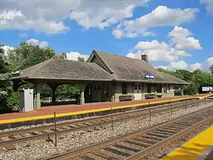 Golf is a commuter railroad station on Metra's Milwaukee District North Line in Golf, Illinois. The station is located at 1 Overlook Drive, 15.4 miles (24.8 km) away from Chicago Union Station, the southern terminus of the line.[2] It serves commuters between Union Station and Fox Lake, Illinois, and in Metra's zone-based fare system, Golf is in zone D. As of 2018, Golf is the 133rd busiest of Metra's 236 non-downtown stations, with an average of 355 weekday boardings.[1] The station also houses the Golf Police Department.