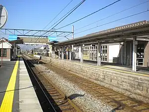 The station consists of one ground-level island platform and one ground-level side platform connected to the station building by a footbridge. The station is unattended.