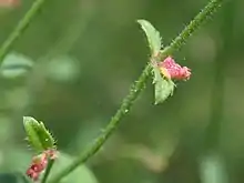 It is an erect perennial herb, woody at the base, 30–40 cm tall and 20–30 cm wide.[9] Its stems are 4-angled in cross section. Leaves are opposite and ovate, with toothed margins and 7–22 mm long. They have a dark green upper surface and a lighter undersurface, stems are often reddish.[9] Both the leaves and stems have stiff, spreading hairs.[6] Flowers are small and solitary, occurring in pairs of bracts in the leaf axils along the lower section of the flowering stem.[10] They are carried in racemes at the end of the stem.[11] Bracts are green and fleshy, petals are green to reddish. Plants are monoecious,[11] and flowering occurs from October to January.[12] Fruit is an ovoid, silver-grey ribbed nut, about 1.5 mm long.[13]