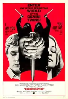 Goodbye Gemini (also released as Twinsanity) is a 1970 British psychological horror film directed by Alan Gibson and starring Judy Geeson, Michael Redgrave, and Martin Potter.[3] Based on the novel Ask Agamemnon by Jenni Hall,[4] it concerns a pair of unusually close fraternal twins, Jacki and Julian, discovering Swinging London while home on Spring Break. Their experiences complicate the pair's relationship, which is already strained due to Julian's incestuous fascination with his sister, which he sees as a natural manifestation of what he believes to be the pair's hive-minded nature.