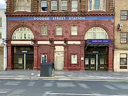 Goodge Street has a Second World War deep-level air-raid shelter underneath it, and is one of eight such stations.[10] From August 1943 until the end of the Second World War the Goodge Street shelter was used by the Supreme Headquarters Allied Expeditionary Force (SHAEF) as an alternative headquarters to Norfolk House and the offices on Grosvenor Square, to be used in the event of successful bombing or rocket attack on those locations. The shelter has two entrances, one on Chenies Street (pictured below) and the other on Tottenham Court Road next to the American International Church.