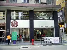 In 2003, the company introduced its trademark slogan, "Delay No More". The phrase is a homophonic translation of the Cantonese profanity díu néih lóuh móuh (屌你老母) "fuck your mother", but in English it is a call to action; and it is emblazoned on T-shirts and other products.[10][11]